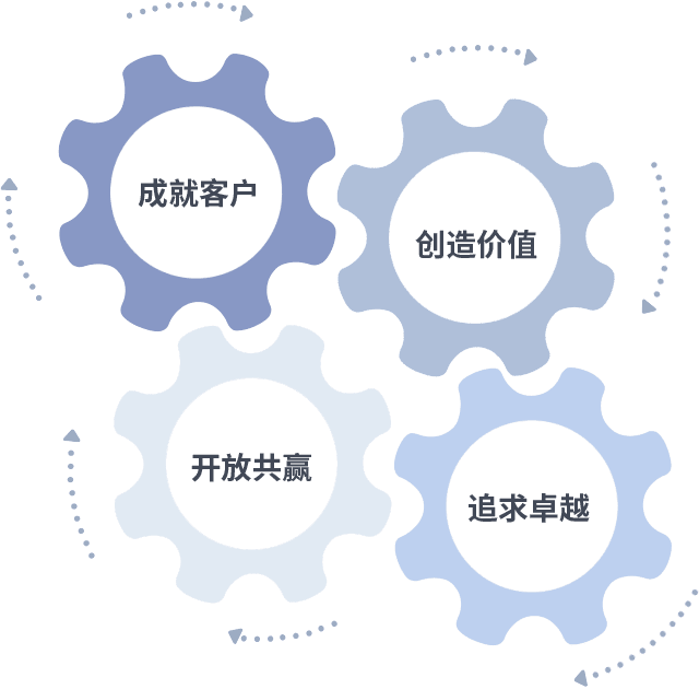 成就客户是一切决策的出发点,,,,创造价值是衡量所有工作的标准,,追求卓越是我们做事做人的态度,,开放共赢是我们的格局也是最终的结果。。价值观的齿轮环环相扣,,,推动着组织里的每个人不断向前。。。。