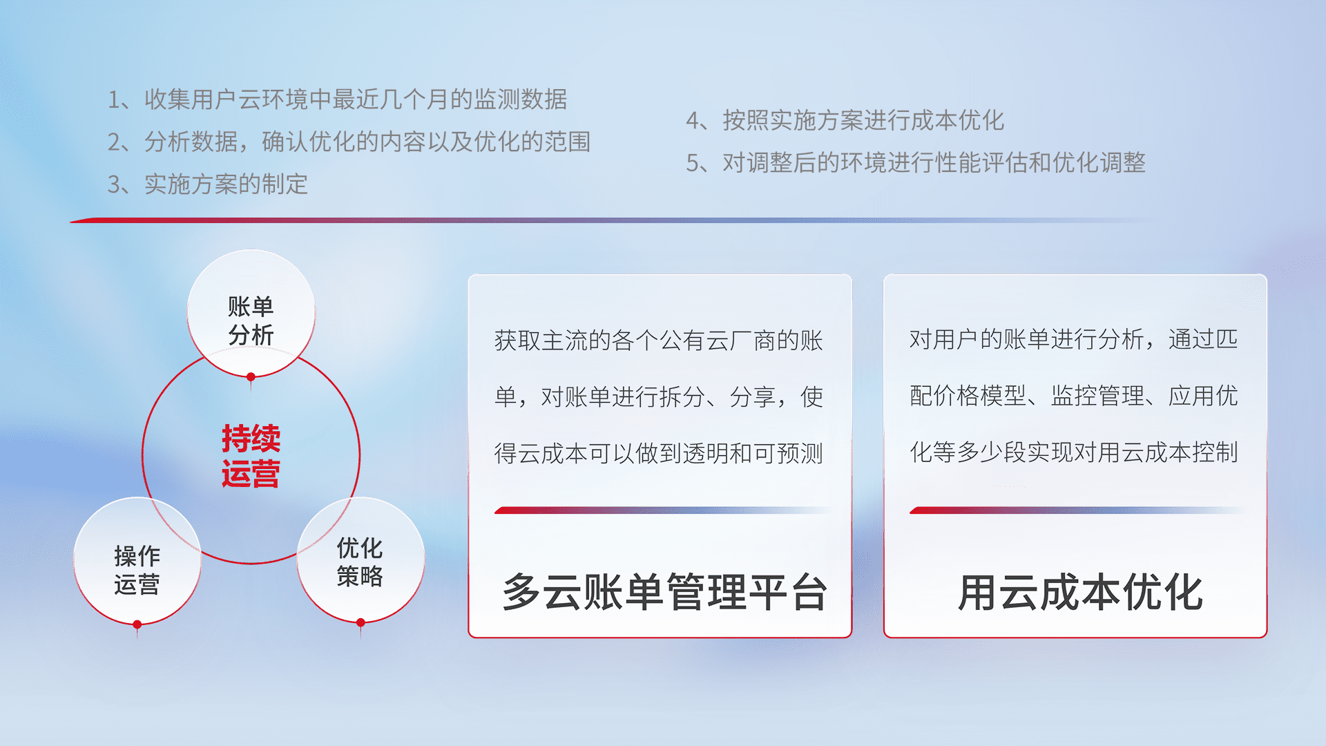 通过多云纳管,,,以统一的资源数据模型把客户的云资源进行抽象和封装,,进而实现对多云资源的统一操作,,保障云资源管理的可靠性、、、稳定性与可用性。。。量身定制化运维内容,,,,配置、、开发运维、、、补丁管理、、、、备份、、、、监控、、、、认证和访问管理、、审计和日常巡检等,,,保障在用云过程中的可靠度,,,稳定度以及高可用率。。